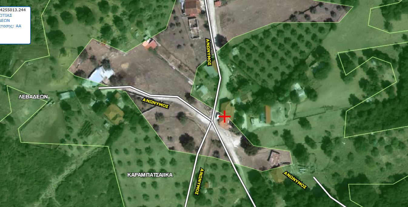 Στο πιό πάνω απόσπασμα δασικού χάρτη φαίνεται ένα χαρακτηριστικό σημείο (συντεταγμένες ΕΓΣΑ χ: 397482, ψ: 4254968) του οικισμού Καραμπατσαίικα, Νομού Βοιωτίας, Δήμου Λεβαδέων, όπου στους αναρτημένους δασικούς χάρτες φαίνεται ένα σπίτι το μισό να καταλαμβάνεται από δασική έκταση και το άλλο μισό από μη δασική έκταση.